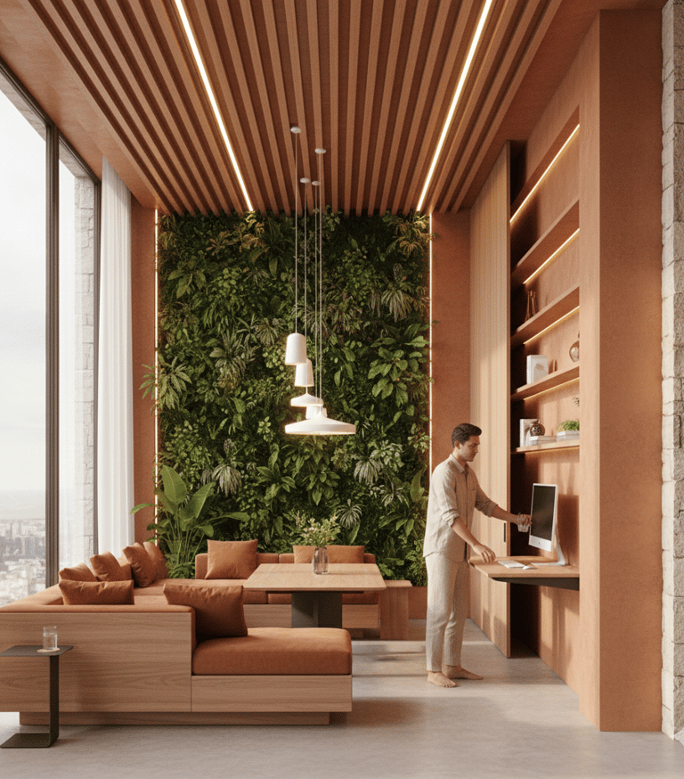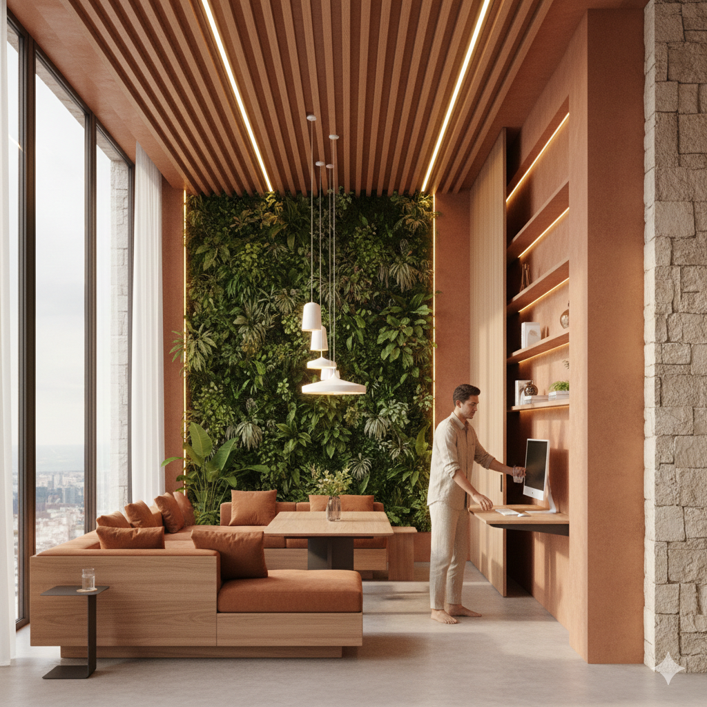 Integrasi alam ke dalam ruang sempit melalui taman vertikal pintar dan penggunaan material organik seperti terakota mencerminkan kerinduan masyarakat urban akan koneksi dengan bumi.